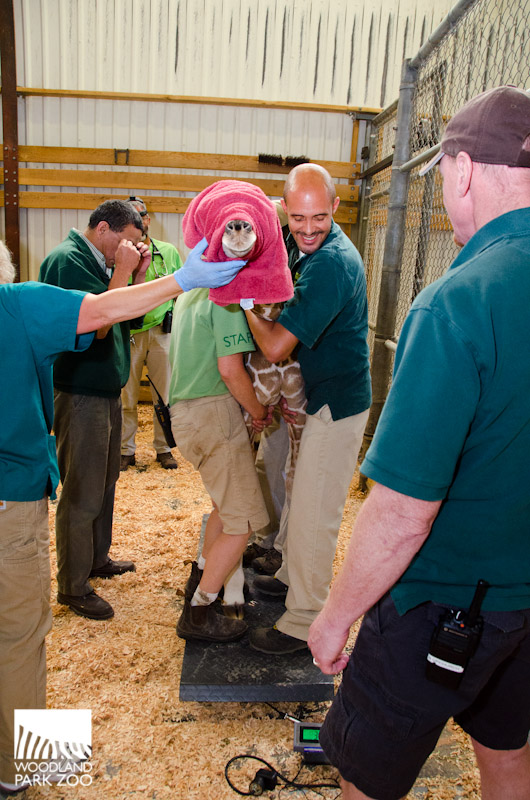 Weighing the calf was an interesting exercise. First, we placed a towel over his head to eliminate distractions and keep him calm during the exam. Then four keepers walked onto the scale with the calf to help him stay in place long enough to get an accurate measurement. Subtract the combined weight of the keepers, and you've got a weight for the calf—144 pounds!